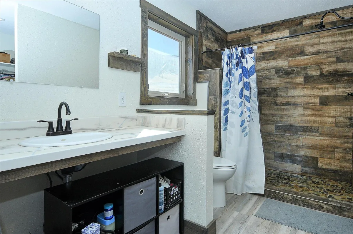 The master suite is a serene retreat, featuring a 3/4 en suite bath and a walk-in closet. Three additional bedrooms share a full guest bath, offering ample space for family or guests. Designed for the rugged mountain lifestyle, this home is equipped with spray foam insulation, an on-demand hot water system, a high-efficiency forced air furnace, and a high-producing well—ensuring comfort and efficiency year-round.