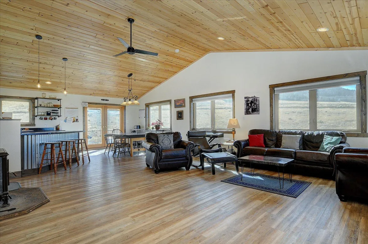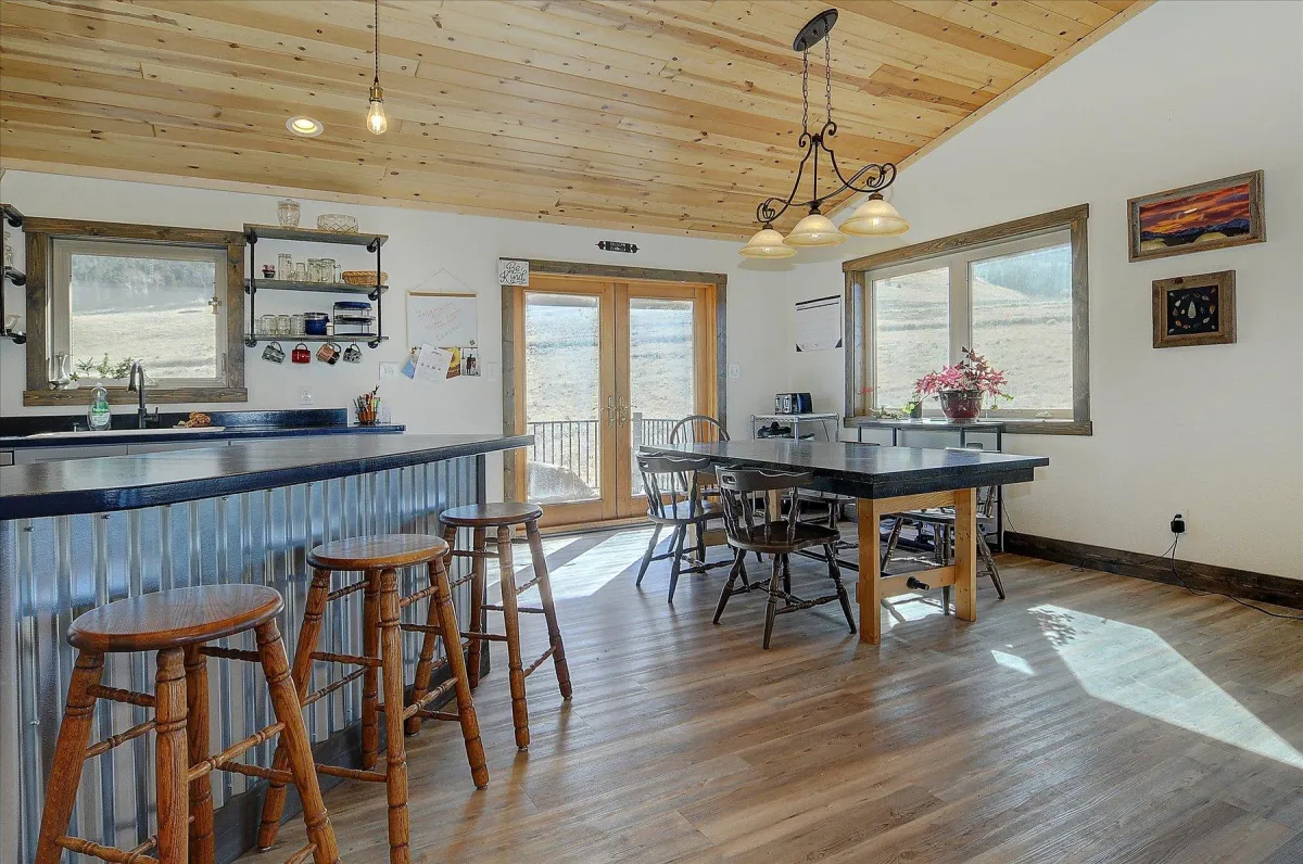 As you step inside, you’re greeted by soaring vaulted T&G pine ceilings and an abundance of windows that flood the space with natural light, allowing you to fully take in the panoramic views of the Sangre de Cristo Mountains. Here, herds of deer and elk roam freely, making this home feel like a sanctuary. The open floor plan, complete with luxury vinyl plank flooring and custom epoxy countertops, creates a warm and inviting space. The kitchen is made for entertaining, offering unobstructed views of the surrounding landscape and cleverly designed cabinets that provide ample storage space, ensuring you can host family and friends in style. The Hearthstone wood stove not only adds charm but provides cozy warmth during chilly Colorado nights, while the expansive Trex deck offers an additional outdoor living space for entertaining or simply soaking in the natural beauty that surrounds you.